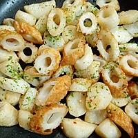 - 4 ちくわに焼き色がついたら弱火にし、青のり、(A)を入れ炒め合わせます。