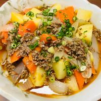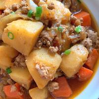 豆板醤と山椒の絶妙な組み合わせが特徴的な、和洋折衷の肉じゃがです。ホクホクのじゃがいもとジューシーなひき肉が相性抜群で、花椒の痺れる香りが食欲をそそります。作り方のポイントは、じゃがいもとにんじんを電子レンジで下準備すると時短に。豆板醤の量は好みで調整できるので、辛さは家族に合わせて加減してください。とろみをつければさらに食べやすくなりますよ。