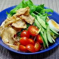 今回は豚バラブロック肉を使用していますが、しゃぶしゃぶ用のお肉などを茹でてから乗せるとさっぱりお召し上がりいただけます。 塩加減は、お好みで調整してください。