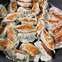 ①焼く→②蒸す→③焼く、の③工程目で仕上げの最中の写真です。いつも我が家の餃子の中のアンの材料は豚挽き肉、キャベツ、玉葱、ニラ、生姜、出汁(顆粒)、ごま油、塩コショウ、卵で作っていますが、こちらもすごく美味しかったです♪またトライします!