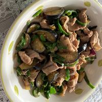 - 5 豚バラ肉の色が変わったら2を入れて炒め、ナスがしんなりしたら1を入れて炒めます。