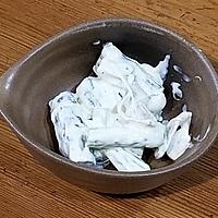 - 2 お湯を沸騰させた鍋に1を入れ、3分程ゆで、冷水にさらし冷まします。筋を取って水を張ったバットに入れ、1時間程おいてアク抜きをします。