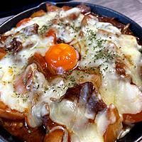 - 3 ピザ用チーズの半量をのせて卵を1つ割り入れ同様にもう一つ作ります。オーブントースターでこんがりと焼き色がつくまで10分程焼いて完成です。