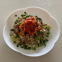 - 4 中央にキムチをのせ、小ねぎを散らして出来上がりです。