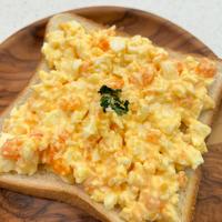 常温の卵➕水から小さなお鍋(直径14㎝ぐらい)4個、割れ目をお尻広い先をコンコン叩く➕塩(3本指)ひとつまみ→お鍋がボコボコ→10分間茹で→火から下ろし→熱湯を捨て→水を入れ→水の中で卵の皮をむく✨6歳娘も大好きです💓 AJINOMOTO→適量、砂糖→小さじ半追加💡マヨネーズは、卵1個に対して大さじ1です✨✨
