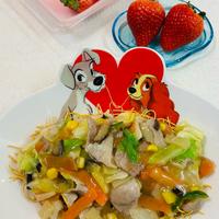 豚バラ、キャベツ、玉ねぎ、ピーマン、人参、たけのこ、きくらげ、椎茸、コーン