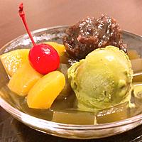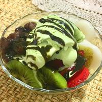 冷たいフルーツを盛り付けて、たくさんの抹茶味のあんみつを食べれてとで幸せでした!