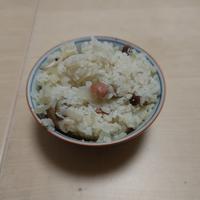 - 1 炊飯窯に米、(A)を入れ、1合の目盛りまで水を入れ、混ぜ合わせます。