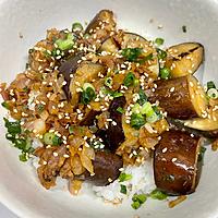 たっぷりの香味野菜がさわやかなどんぶりです。ナスが煮汁を吸って、じゅわっと口の中で溢れます。食欲がない時でも、香味野菜の風味とポン酢のさっぱりとした味つけで箸が進みますよ。