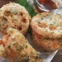 生姜がさっぱりしていて、良かったです。衣の加減が難しいですねちょっと、強すぎたかな💧薄っすらレンコンが見えるぐらいの方が、綺麗ですね。
