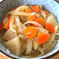 - 1 大根とにんじんは皮をむき、3mm幅のいちょう切りにし、玉ねぎは薄切りにします。