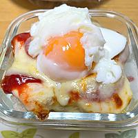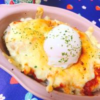 半熟卵とサラダチキンのドリア風のご紹介です。ピザソースを使った簡単に出来るドリアのレシピです。とろーりチーズと温泉卵がごはんに絡み、とてもおいしいですよ。包丁やまな板を使わずに作れるので、ぜひお試しくださいね。