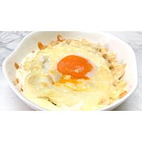 直径16cm、容量500mlの耐熱皿を使用しました。 お使いのトースター機種によって焼き加減が異なりますので、様子を見ながらご調整ください。今回は1000W200℃で焼いています。トースターは庫内が狭く、食材と熱源の距離が近いため、加熱中の食材の油が落ちたり、油はねなどが原因で発煙、発火の恐れがあります。加熱中は目を離さないでください。 ご高齢の方や、2才以下の乳幼児、妊娠中の女性、免疫機能が低下している方は、卵の生食を避けてください。