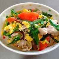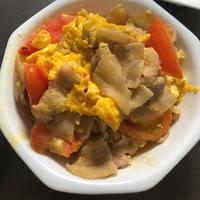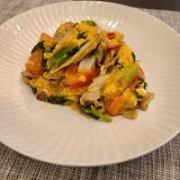 手に入りやすい食材をふんだんに使った、肉野菜炒めです。トマトは生でも美味しいですが、火を通すことによって甘みやうまみが増します。今回はお肉、野菜、きのこ、卵とたくさんの食材を入れた、食べ応えの良い一品に仕上げました。ごま油の風味が食欲をそそります。ぜひお試しください。