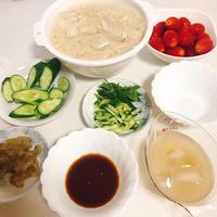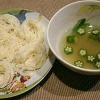 ワンパターンになりがちな素麺をちょっとアレンジしたくて挑戦しました。オクラは加熱せず薄切りで。爽やかさっぱり、今の時期にぴったりですね。
