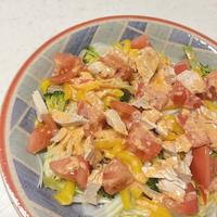生クリームとチリパウダーとパプリカパウダーが無くて豆乳と七味を代用したのでレシピ通りのドレッシングにはならなかったですがそれでも美味しかったです。市販のドレッシングも使いました。材料は並べるだけなので簡単楽チンです♪