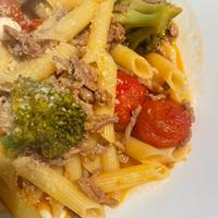 フライパン一つで出来る、別茹でしないペンネです。ひき肉とミニトマトの旨味が効いた一品です。お好みで仕上げに粉チーズやパセリを振ってもおすすめです。塩加減はお好みで調整して下さい。是非一度お試しくださいね。