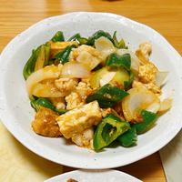 鶏むね200gでピーマン3つ、厚揚げ一枚と玉ねぎ半分追加しました。