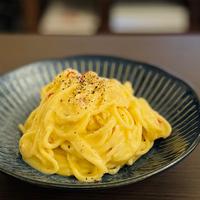 - 8 5のスパゲティを軽く湯切りして入れ、和えます。弱火にかけ4を加えとろみがつくまでさっと混ぜ合わせます。