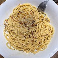 - 6 スパゲティをゆでている間に2を弱火で熱し、ふつふつと泡が立ってきたら鷹の爪輪切りを加えて加熱します。