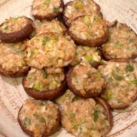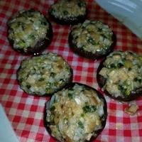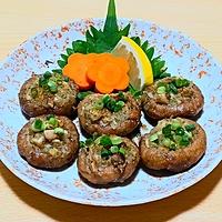 - 5 天板にアルミホイルを敷き、しいたけを裏にして並べ、4を詰めます。