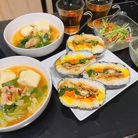 中身をアレンジしてキンパ風に、たくあん、にんじん、焼き肉、ほうれん草にしました。