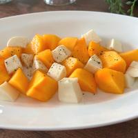 柿とモッツァレラのカプレーゼ風のご紹介です。甘みのある柿とさっぱりとしたモッツァレラチーズをオリーブオイル、塩、黒こしょうで和えました。シンプルな調味料ですが、柿の甘みとよく合い、白ワインのおつまみなどにもおすすめです。ぜひお試しくださいね。