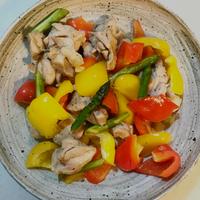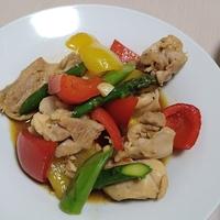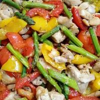 3色の野菜と鶏肉のジューシーな組み合わせが魅力的な一品です。アスパラ、パプリカの彩りが美しく、切って炒めるだけの簡単レシピ。にんにくの香りとオイスターソースのコク深い味わいが食欲をそそります。お好みでブロッコリーやしめじを加えてアレンジも楽しめます。メインおかずとしてはもちろん、彩りが綺麗なのでお弁当のおかずとしても最適です。