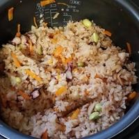 - 3 炊飯釜に米、(A)を入れて混ぜます。水を2合の目盛りまで注ぎ、1、2,枝豆を入れ、炊飯します。