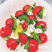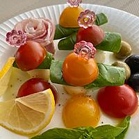 - 2 爪楊枝で1、バジル、モッツァレラチーズの順に刺します。