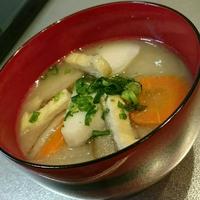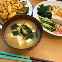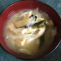- 3 1の野菜だしをお鍋に戻し豆腐、油揚げを入れ沸騰したらわかめを入れ火を弱め味噌を溶かし長ネギを入れたら完成です。