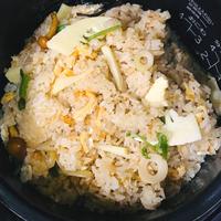 - 2 炊飯釜に米、もち米、(A)、水を3合の目盛りまで入れ混ぜ合わせ、1、山菜の水煮を加えて炊飯します。