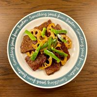 牛肉はコマ肉ではなく焼肉用を使いました。これメチャ旨いですね。甘辛だれと肉の脂の甘みで、ご飯との相性抜群です。併せて、蓮根のシャキシャキがアクセントになります。お代わり必須!是非試してみてください。