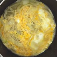 - 3 全体に味が染み込んだら、沸騰した状態で溶き卵を流し入れ、蓋をして加熱します。
