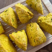 かぼちゃを皮ごと入れたスコーンです。生姜を加えて、すっきりとした後味に仕上げました。大人向けの味です。ホットケーキミックスを使えば粉類の計量も楽ちんです。バターの合わせ方にひと手間加えるだけで、サクっとした口あたりになります。