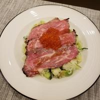 - 6 お皿に5を盛り付け、ローストビーフ、イクラを順にのせて完成です。