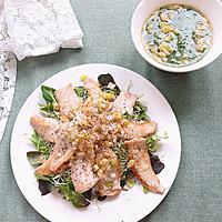 - 5 グリーンリーフを敷いた器に盛り付け、黒こしょうを振ります。レモンを絞ってお召し上がりください。
