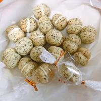 - 5 1cm角に切り分けて丸め、天板に並べて160℃のオーブンで15分火が通るまで焼きます。