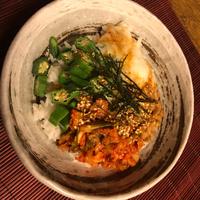 ネバネバ食材の代表、長芋とオクラにキムチを合わせて丼にしました。コクのあるキムチとさっぱり味の長芋とオクラの組み合わせが相性抜群です。ピリ辛のたれがさらに食欲をそそる味つけですので、ぜひ試してみてくださいね。