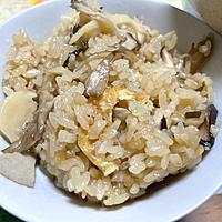 きのこは椎茸3個、エリンギ1本、しめじ1/4株を使用し、生醤油を小さじ1加え、2号の目盛りの下まで水を入れ、炊き込みモードで炊きました。