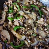 - 3 ナスに焼き色がついたら豚ひき肉を入れて中火で炒めます。
