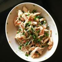 - 1 耐熱ボウルに鶏むね肉を入れ、塩を振り、料理酒をかけてラップをし、600Wのレンジで4分火が通るまで加熱します。粗熱が取れたら手で一口大に裂きます。