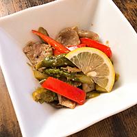 - 4 フライパンにオリーブオイルをひき、3を中火で炒め、焼き色がついたら2と1で絞ったレモン果汁、(A)をいれ、パプリカがしんなりするまで炒めます。