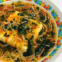 - 5 顆粒だしを加えたら、2とかまぼこを加えます。