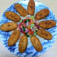 パン粉を出来るだけ多めにまぶし小判型に成形して揚げました。