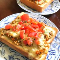 - 4 食パンをスプーンの背で押してくぼみを作り、3をのせ、ピザ用チーズを散らします。