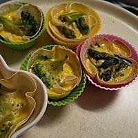 他のレシピを参考に、餃子の皮をシリコンカップにしいて、そこに生地を流しました。トースターだけではなかなか固まらないので、レンジもかけたほうが良さそうです