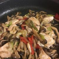 - 6 鶏むね肉に火が通ったら2、4を入れて中火のまま炒め、しめじがしんなりしたら火から下ろします。