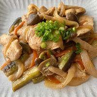 鶏肉は薄めにして火を通りやすくしました。片栗粉も振りました。鶏肉に塩胡椒してもよかったかも。玉ねぎが苦手なのでピーマン2個とえのきを入れました。調味料は特に増やさずでちょうどよかったです!