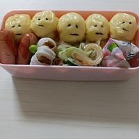 お弁当に入れるのに時間がなく、「急げー!!」と顔を作ったため、ヘンテコな顔が出来あがりました。明太子と潰したゆで卵を入れて、辛さを和らげました。リベンジしたいです。